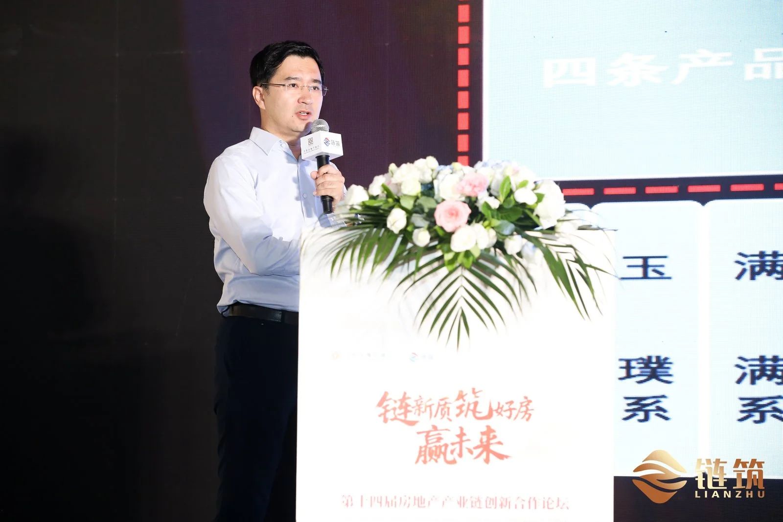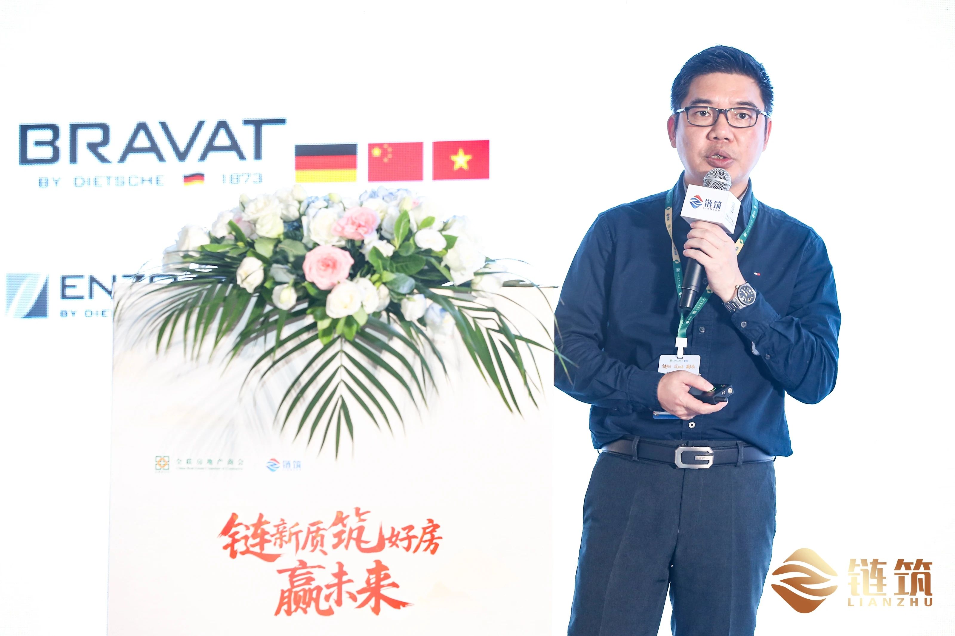 本次高峰对话由全联房地产商会副秘书长、链筑分会秘书长马学明先生担纲主持,邀请到商会链筑分会主席团专家、金隅地产集团总建筑师梅林奇先生;中建壹品北方分公司设计总监韩庆先生;商会链筑分会副会长单位、日丰企业集团建筑工程事业部总经理赵东红先生;商会链筑分会副会长单位、广东亚太天能科技股份有限公司副总经理付朝辉先生一同上台互动交流。