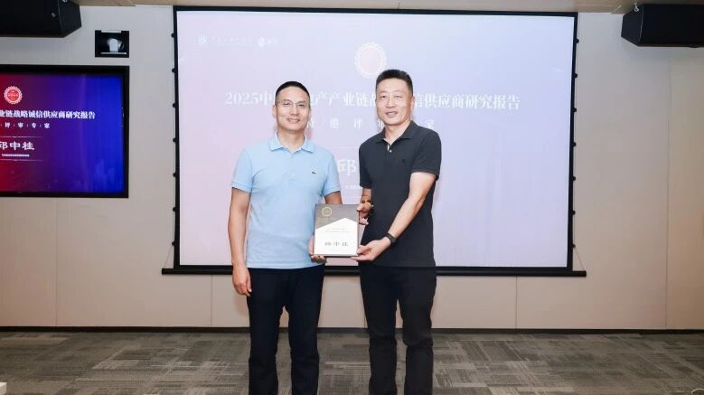 全联房地产商会副秘书长、产业链与建筑工业化分会秘书长马学明先生为华润置地供应链管理部总经理邱中桂先生颁发2025年度《中国房地产产业链战略诚信供应商研究报告》华南站特邀评审专家证书。