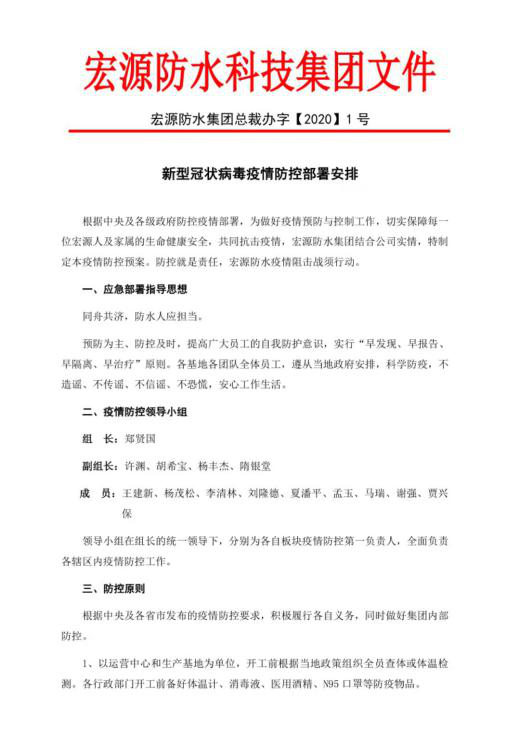 以诚信立世,以品质赢得市场,以技术谋求长远发展。在这一特殊时期,宏源防水将继续遵循自身企业精神,全力以赴,确保疫情防控和企业经济发展两项“战役”的双胜双赢。
