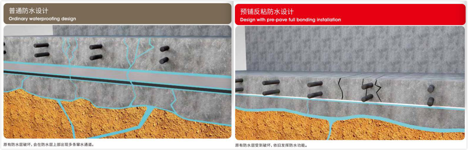 宏源NPS非沥青基高分子自粘胶膜(预铺)防水卷材,及防水设计对比