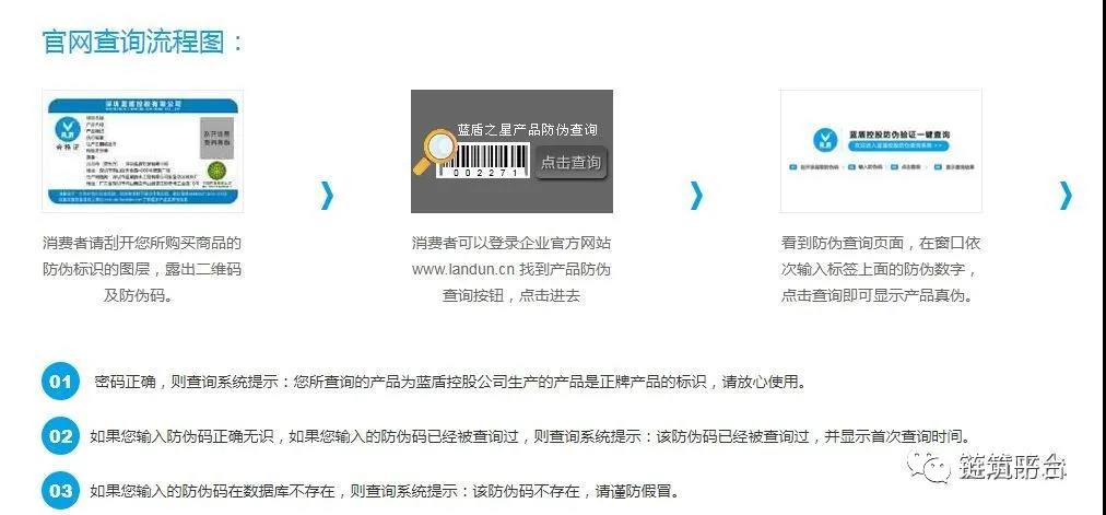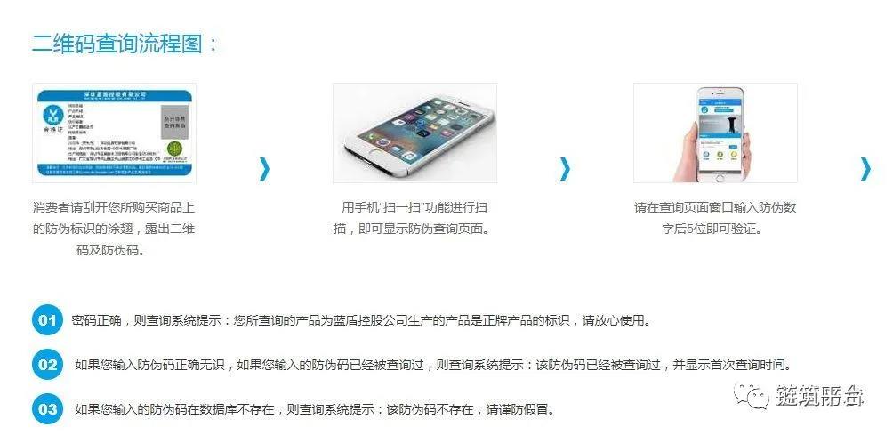 蓝盾有专门的产品认证系统,所有产品都有专属的身份认证,并且在出厂前会贴上蓝盾专属的防伪标签。只要用手机扫描防伪标签,真假材料便了然于心。