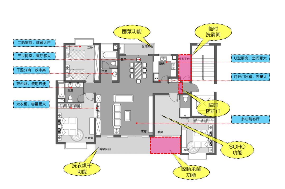 良有方于2月7日发布了《一个“宅家抗疫”的理想户型,2.0版本来了!》,通过户型设计,在入口处增加设备平台,有疫情时,可作为室外和室内的过渡空间,进行消毒等处理,算是半污染区。