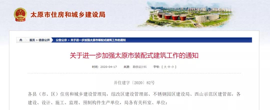 2020年4月17日,太原市住房和城乡建设局发布《关于进一步加强太原市装配式建筑工作的通知》,内容强调 :