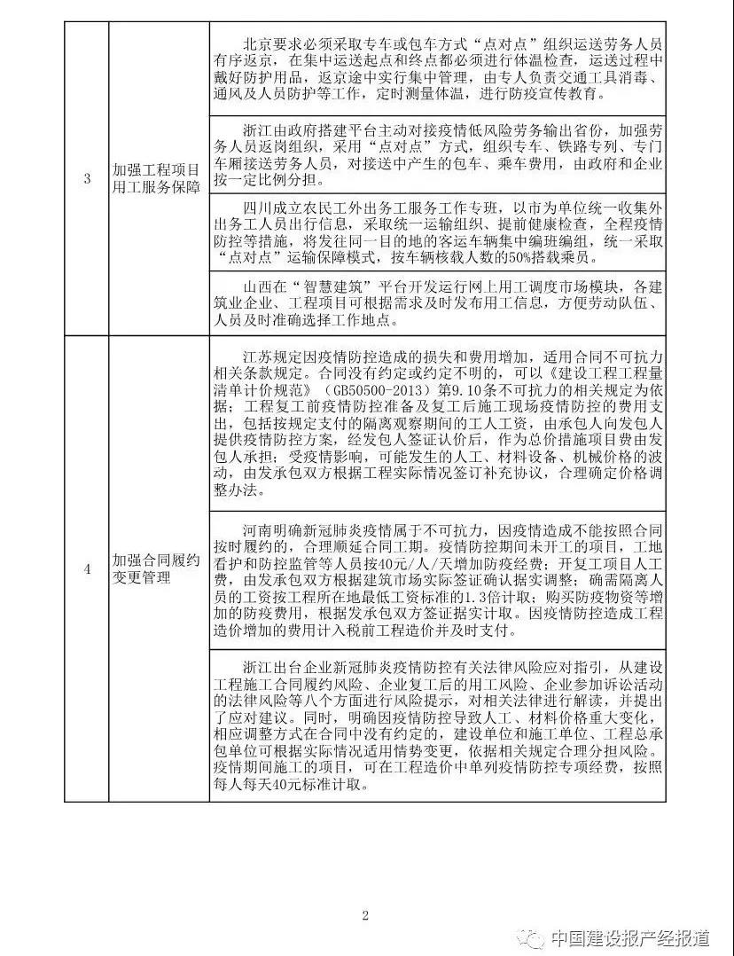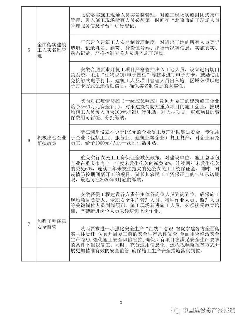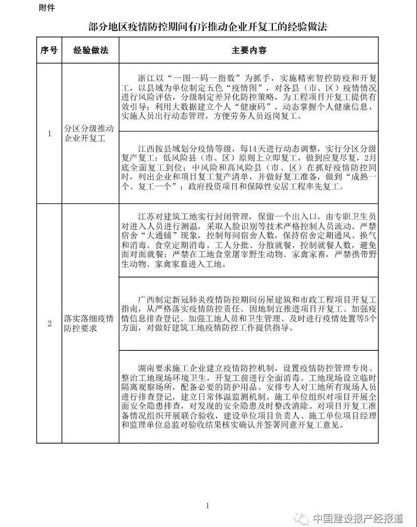 据了解,经验做法包括:分区分级推动企业开复工、落实落细疫情防控要求、加强工程项目用工服务保障、加强合同履约变更管理、全面落实建筑工人实名制管理、积极出台企业帮扶政策、加强工程质量安全监管和加快推进电子政务建设8个方面。