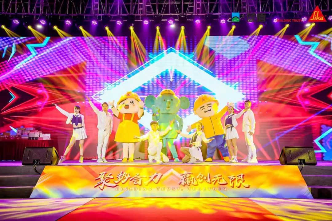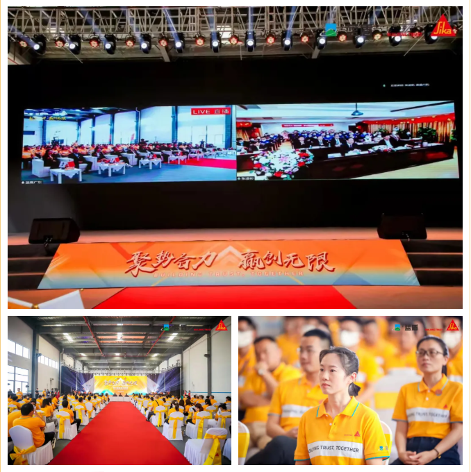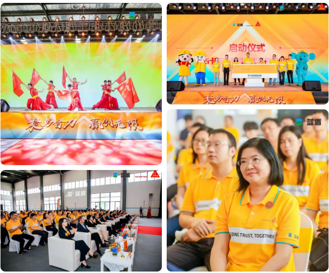舞动的旗帜,代表着蓝盾融入西卡大家庭后的光明愿景;旗鼓阵阵的雄厚节点,点燃了现场氛围,让在场所有人深受感染,为之震撼。在西卡蓝盾网红“西妹”、“K哥“、“蓝尼”的引导下,双方员工代表们上台进行拼图互动仪式,西卡和蓝盾融合成为了一个主体,正式成为了一家人。