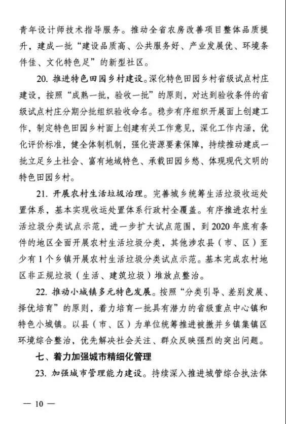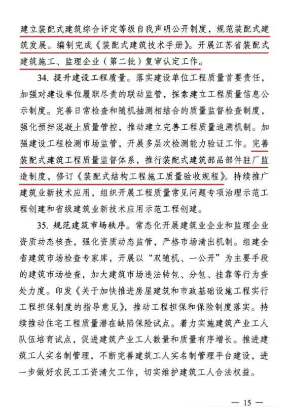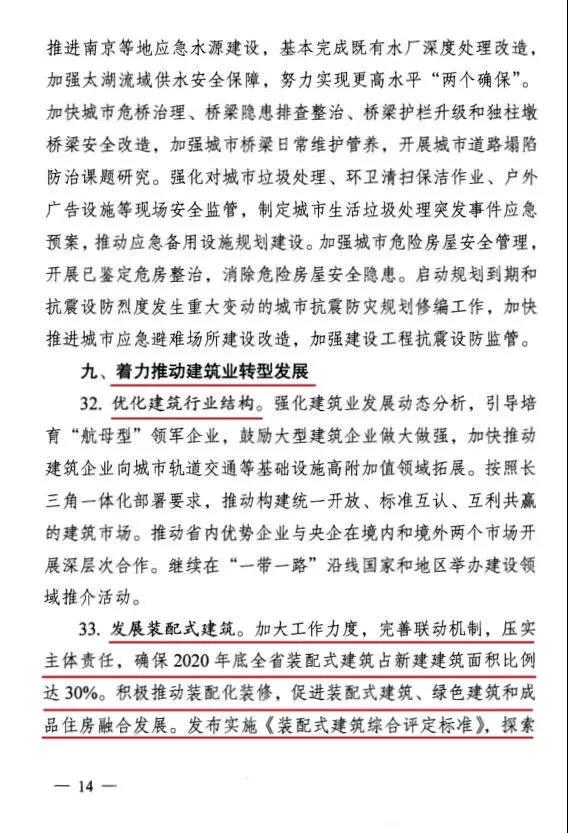 发展装配式建筑。加大工作力度,完善联动机制,压实主体责任,确保2020年底全省装配式建筑占新建建筑面积比例达30%。积极推动装配化装修,促进装配式建筑、绿色建筑和成品住房融合发展。发布实施《装配式建筑综合评定标准》,探索建立装配式建筑综合评定等级自我声明公开制度,规范装配式建筑发展。(正文中P14页、P15页)