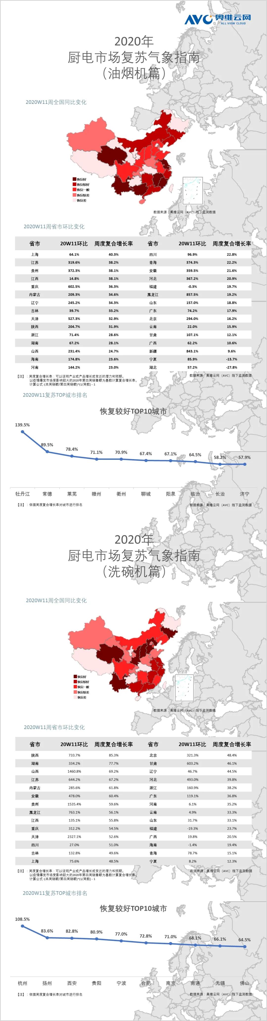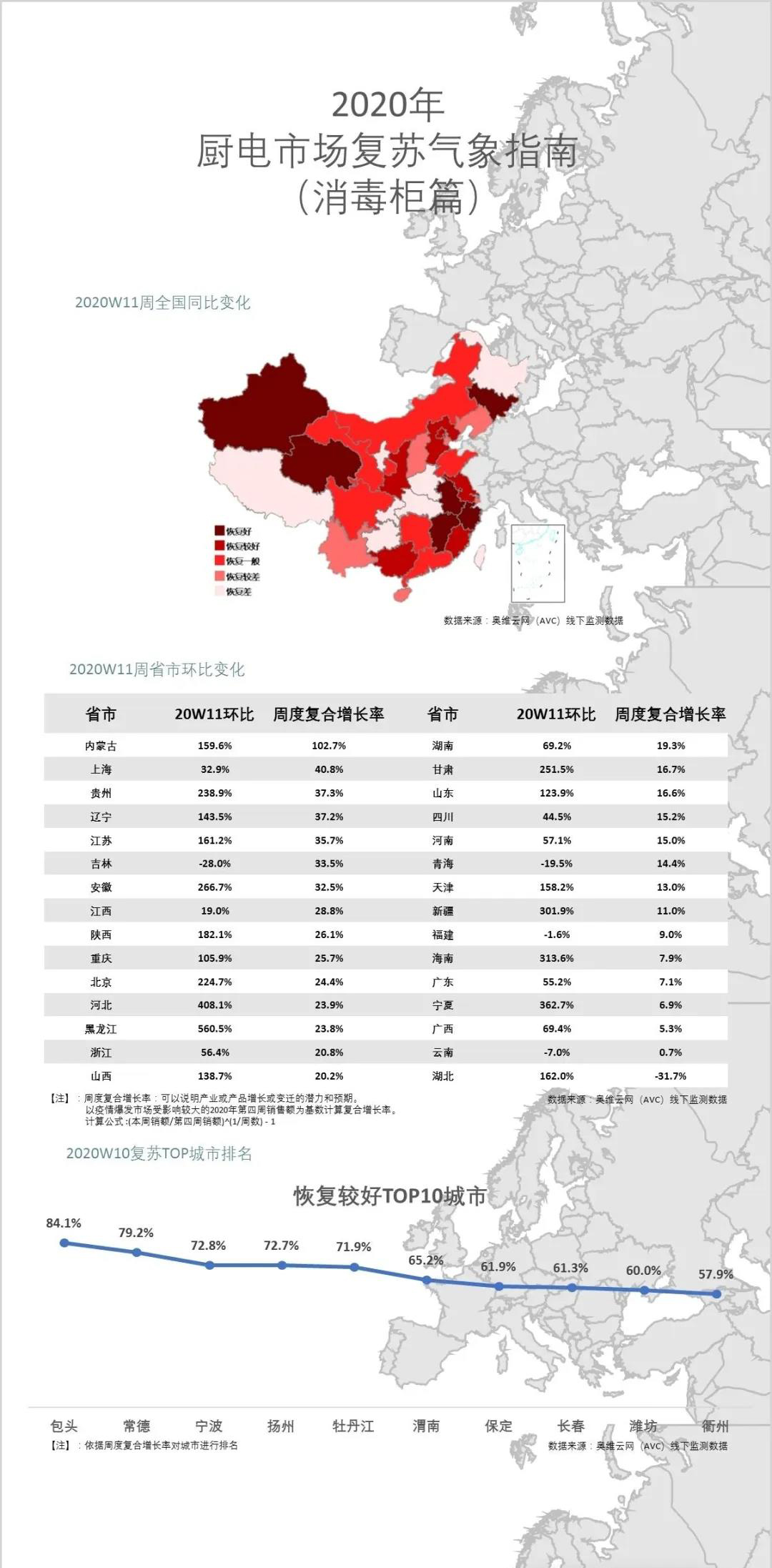 另一方面消毒柜、洗碗机仍然是疫情期间的市场提振担当。从洗碗机线下市场来看,尤其是在以贵州、山西、天津这三个区域,洗碗机第十一周环比增速均达到1400%以上。复合增长方面全国各个省市均呈现正增长趋势。未来洗碗机、消毒柜预计仍将保持强势引领态势,成为线下厨电市场复苏的尖兵。