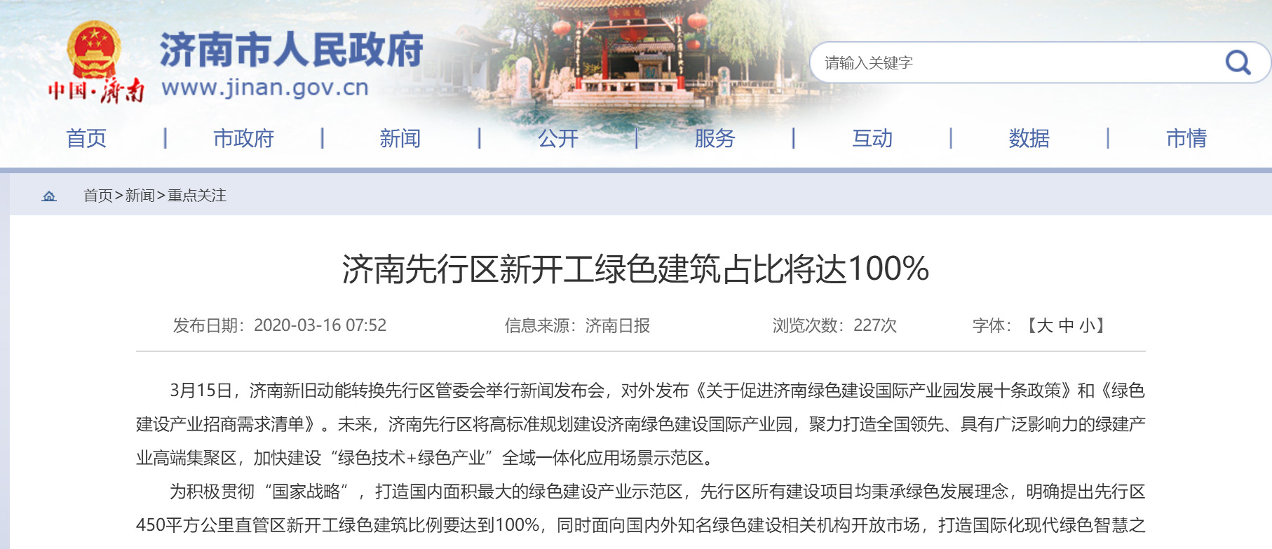 2020年3月15日,济南新旧动能转换先行区管委会举行新闻发布会,对外发布《关于促进济南绿色建设国际产业园发展十条政策》等通知,政策强调: