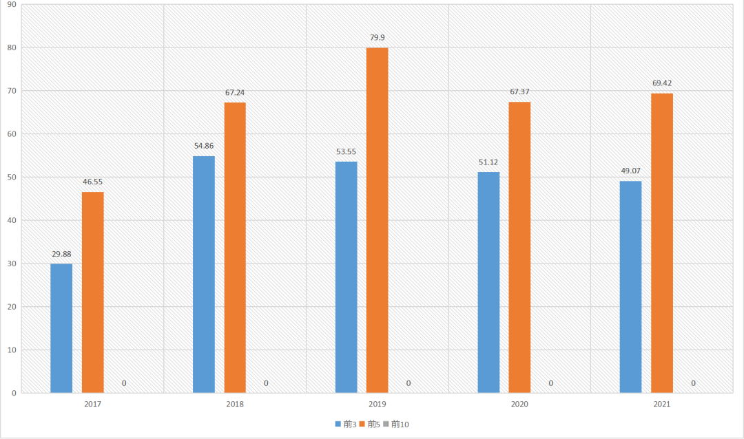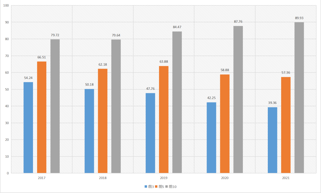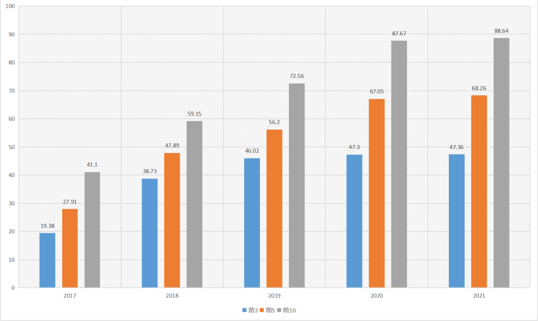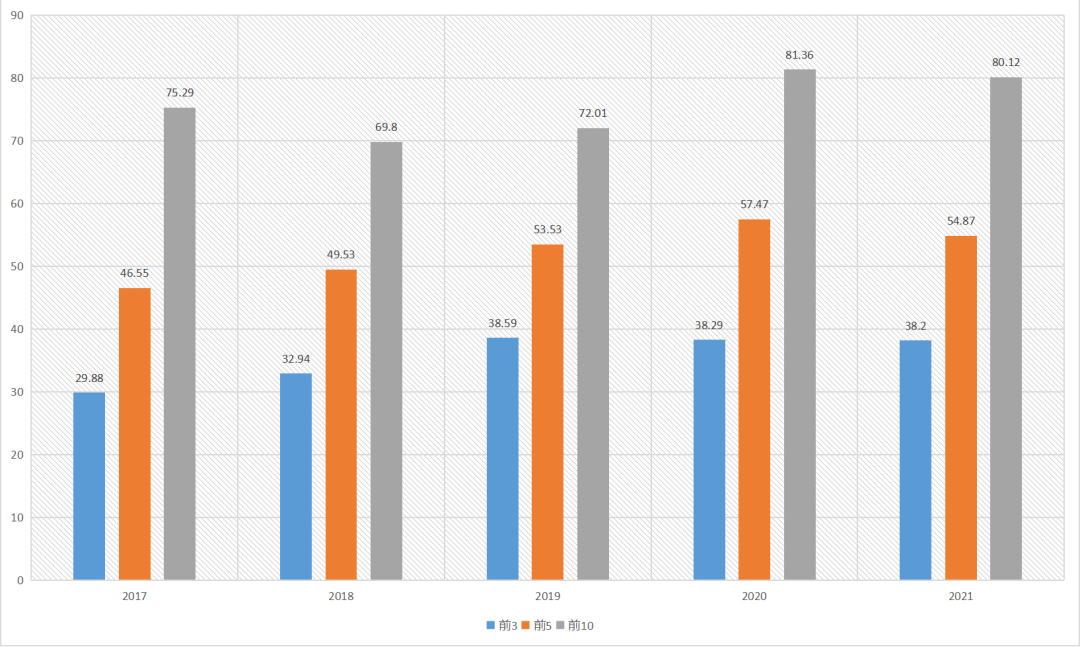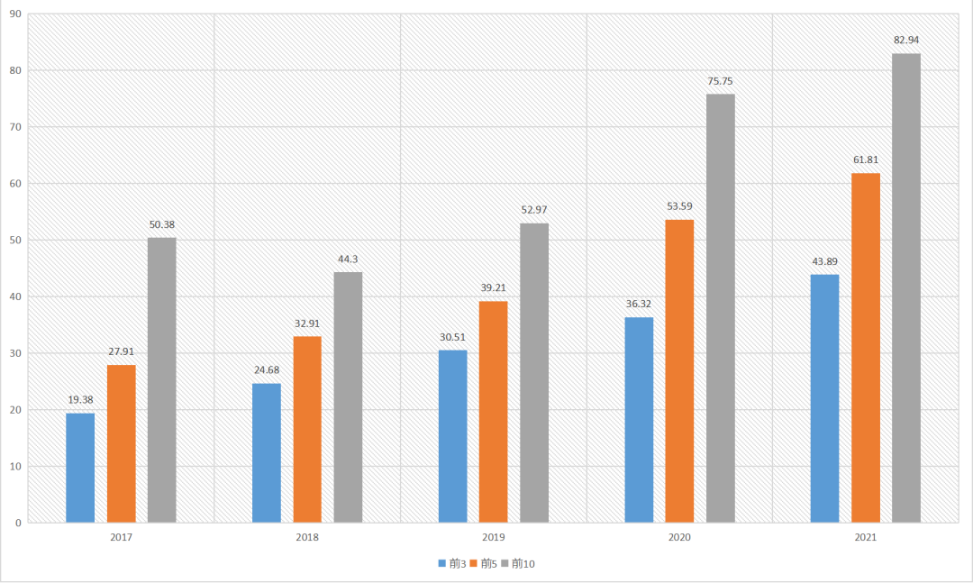 截取5年首选率前3名企业、前5名企业、前10名企业首选率占比情况可发现,系统门窗类首选率前3位企业、前5位企业首选率总体呈现逐年上升趋势,前10位企业首选率除18年略有下降外整体也是呈现出上升趋势,从变化趋势中可以看出近5年来系统门窗行业头部企业竞争优势正在不断加强,行业集中度持续稳步提升,后进企业市场份额呈现进一步下降趋势。