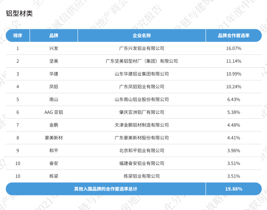 2017—2021的5年中,兴发、坚美、华建稳居首选率排行前3位,凤铝、南山、AAG亚铝、金鹏等企业竞争激烈,截止至2021年兴发、坚美、华建、凤铝、南山位列铝型材行业首选率前5位。