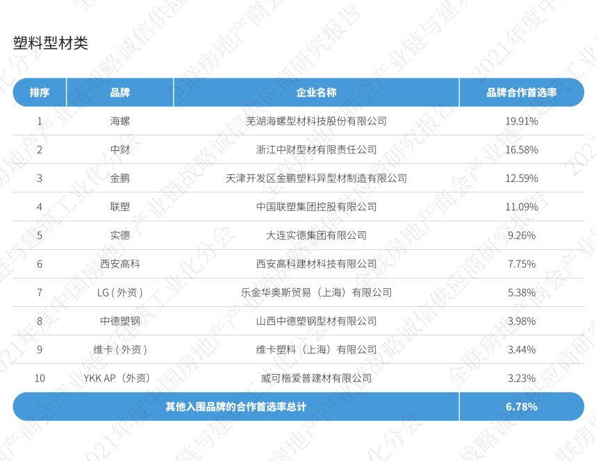 2017—2021的5年中,海螺、中财、金鹏稳居首选率排行前3位,联塑、实德、西安高科等企业竞争激烈,截止至2021年海螺、中财、金鹏、联塑、实德位列塑料型材行业首选率前5位。