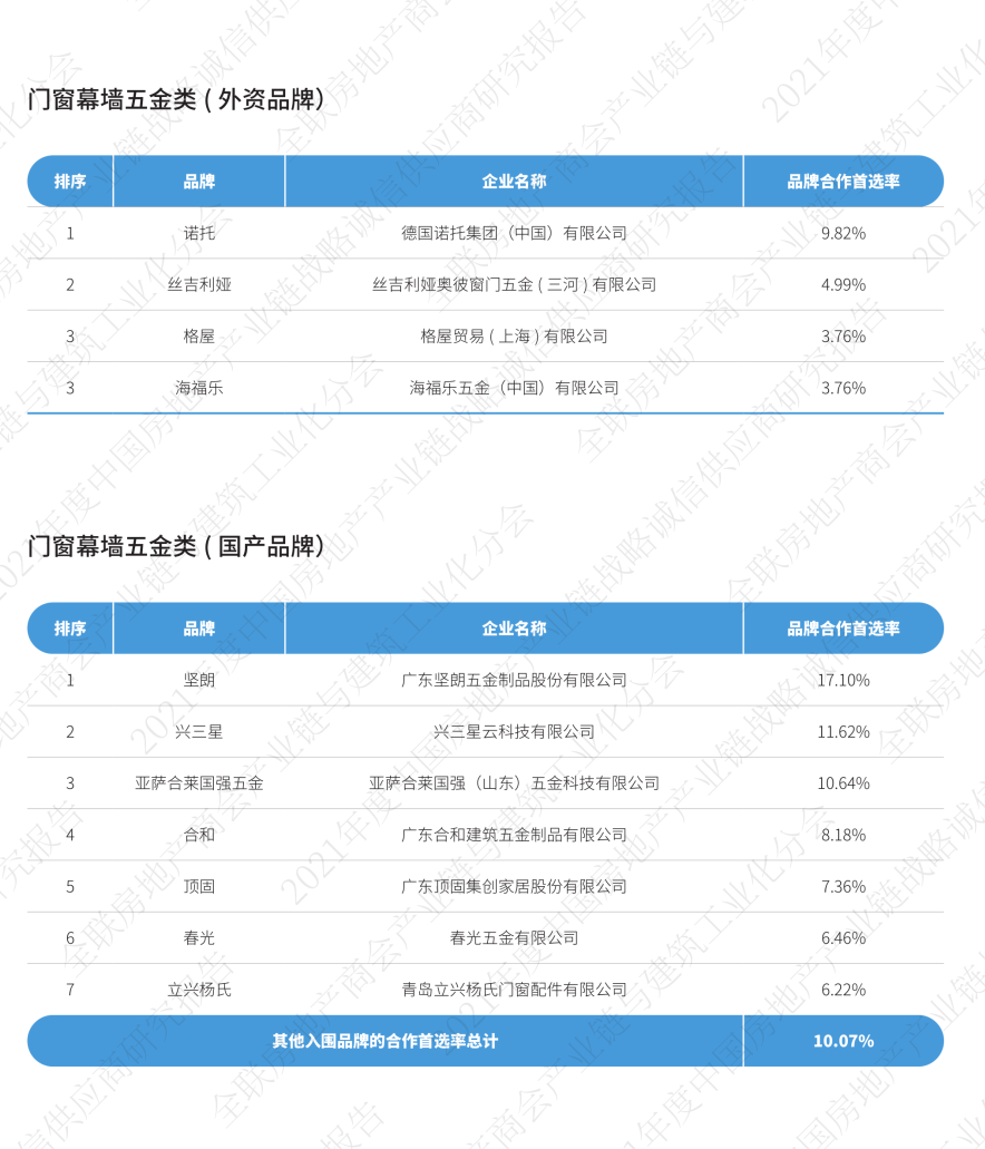2017-2021中国房地产产业链战略诚信供应商——门窗幕墙五金首选率变化趋势