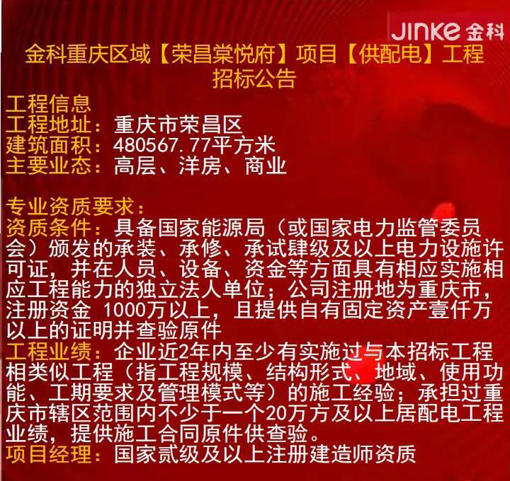 金科地产重庆区域荣昌礼悦东方B组团供配电工程招标公告