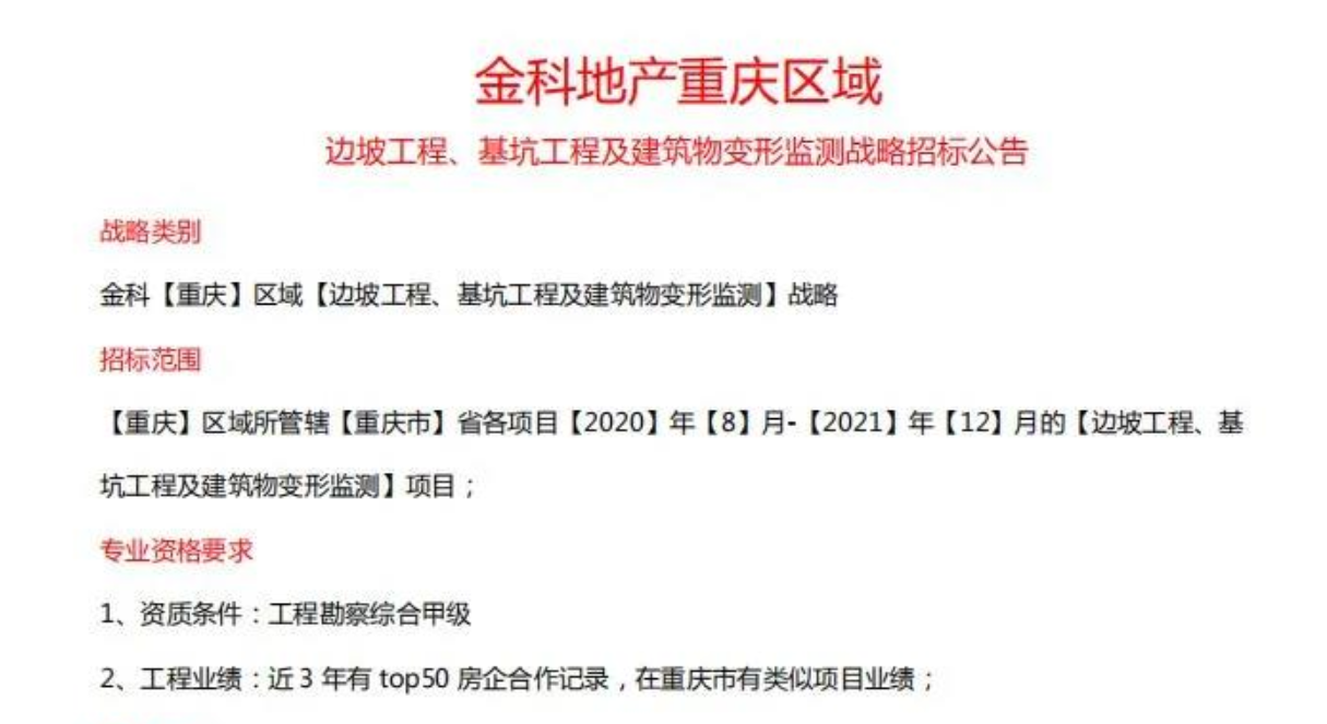 金科地产重庆区域边坡工程、基坑工程及建筑物变形监测战略招标公告