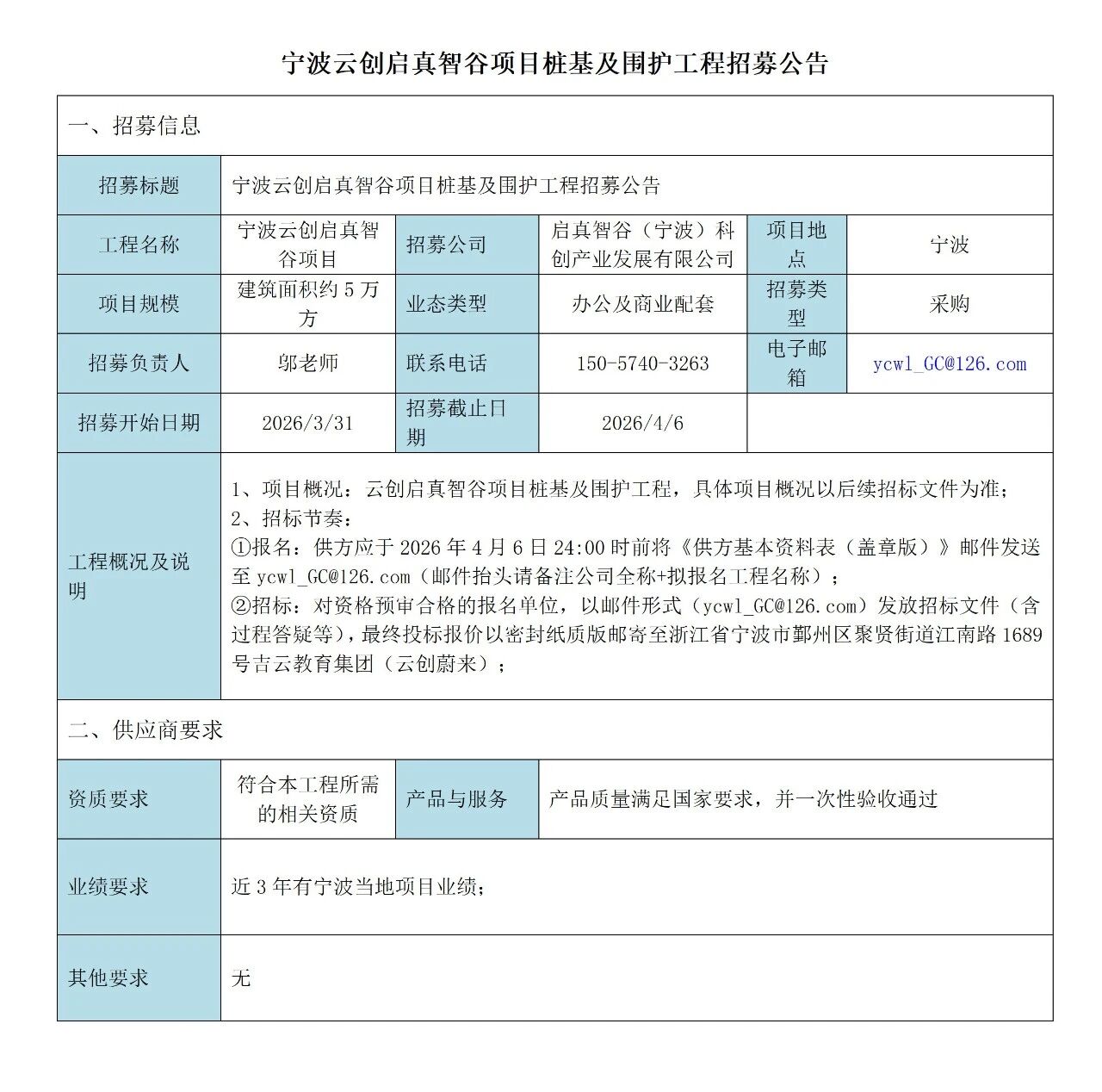 宁波云创启真智谷项目桩基及围护工程招募公告